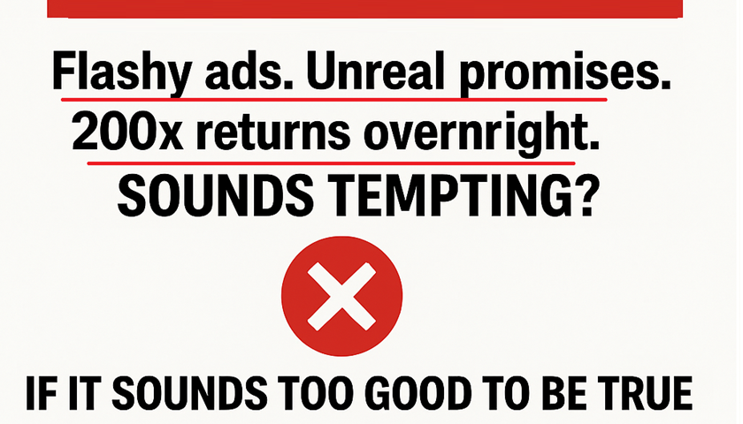 🔹 Avoid believing in flashy ads or claims of 200%–500% returns or “95% accuracy.”